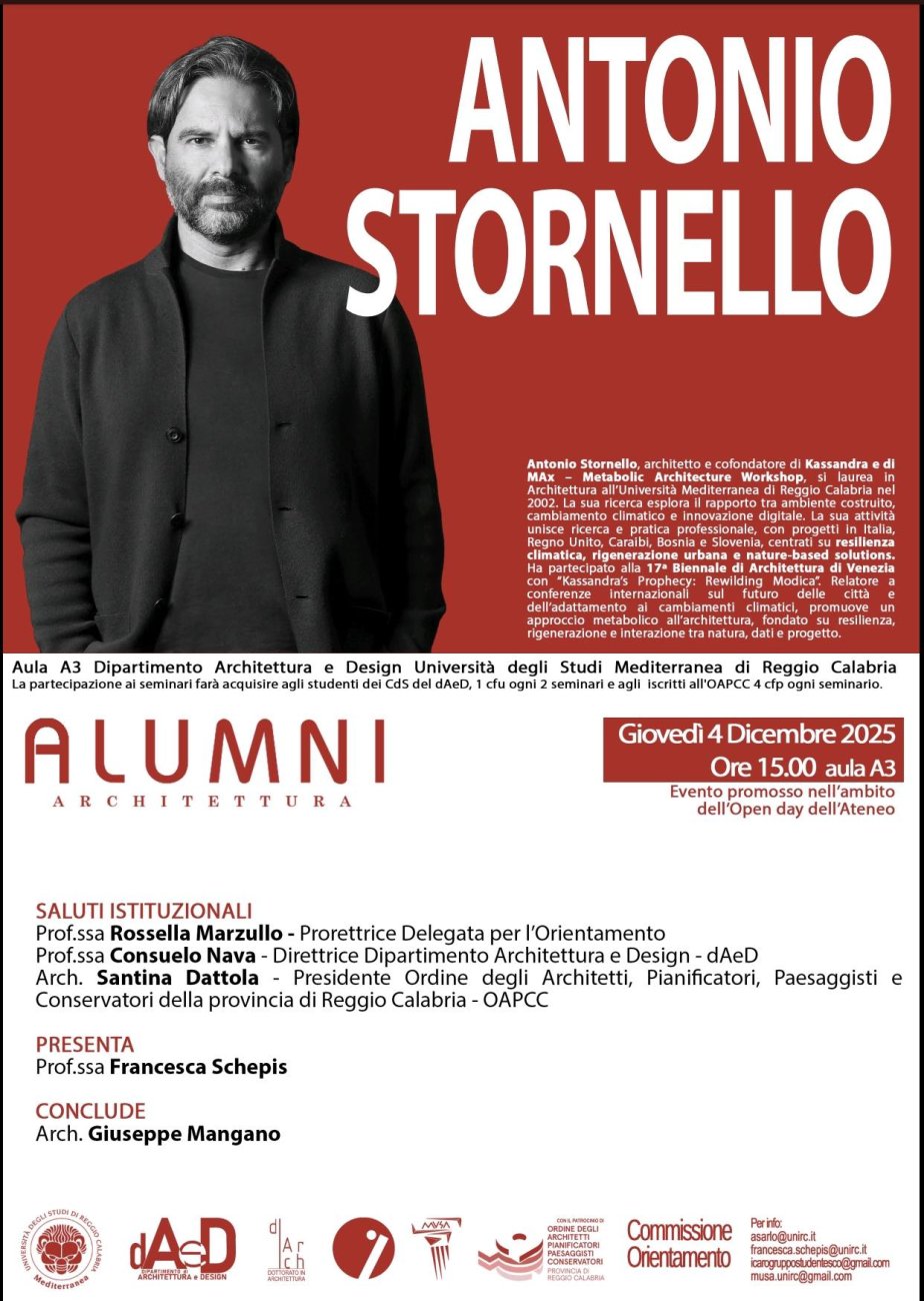 ALUMNI ARCHITETTURA è un'iniziativa lanciata nell’a.a. 2023-2024 che riconosce le storie di eccellenza di ex laureate e ex laureateiin Architettura alla Mediterranea e li invita a raccontare a studenti e docenti, attraverso seminari promossi dal Corso di Laurea in Architettura, dalla Commissione Orientamento, dalle rappresentanze e dalle associazioni studentesce MUSA e ICARO, i percorsi di vita, formativi e professionali affrontati negli anni successivi alla formazione universitaria.