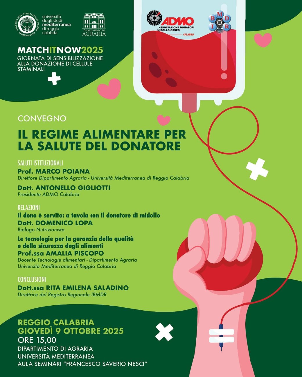L’Aula seminari Francesco Saverio Nesci del Dipartimento Agraria dell’Università Mediterranea di Reggio, ospiterà il prossimo 9 ottobre 2025, alle ore 15,00, il convegno “Il regime alimentare per la salute del donatore”.
