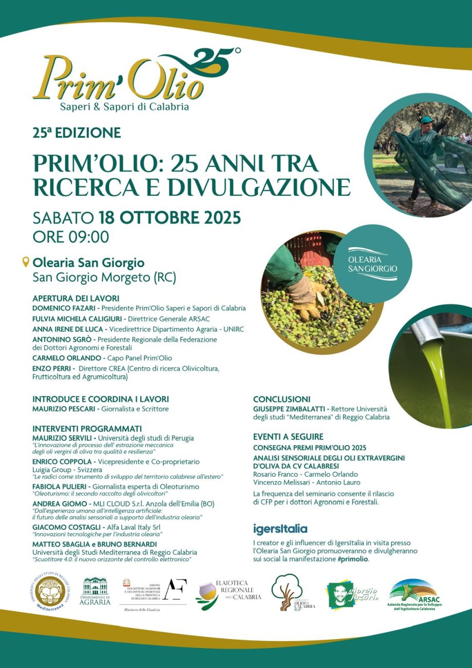 Sabato 18 ottobre 2025 ore 9:00, presso Olearia San Giorgio a San Giorgio Morgeto, si terrà il convegno inaugurale di Prim’Olio – Saperi & Sapori di Calabria, dedicato al tema “25 anni tra ricerca e divulgazione”, organizzato in collaborazione con il Dipartimento di Agraria dell’Università Mediterranea di Reggio Calabria.